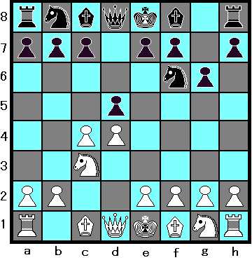 | 黒はc3を狙うために 7 ... c5 、 白はc3を守るために 8 Ne2 と指しています。 |