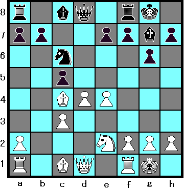 | 4 cd N:d5 , 5 e4 N:c3 , 6 bc Bg7 7 Bc4 c5 , 8 Ne2 o-o , 9 o-o Nc6 |