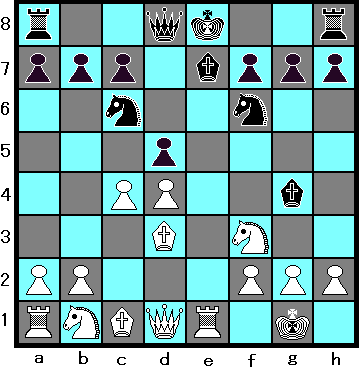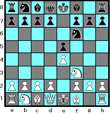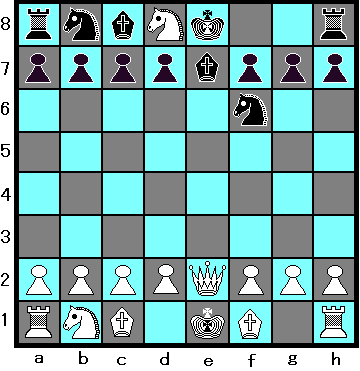 | 後手番なのに相手と同じ手を指すのは不利なので・・・ この定跡は黒のがんばり次第、という話になります。 3 ... N:e4 と3手目まで真似してしまうと、 4 Qe2 Nf6 , 5 Nc6+ Be7 , 6 N:d8 と進んで、 下図のようにクイーンを取られてしまいます。 |