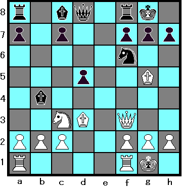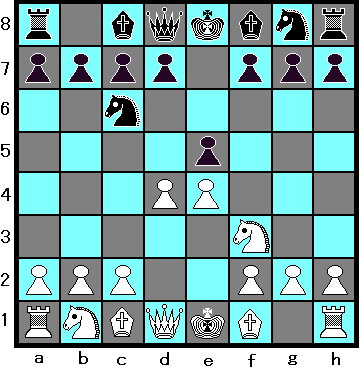 | 3 ... ed , 4 Bc4 Bc5 , 5 c3 dc , 6 N:c3 d6 , 7 Bg5 Qd7 |
