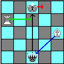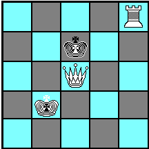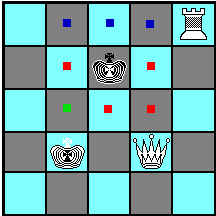 | ステイルメイト | 引き分け。自分の番のとき、自分の駒が一つも動けず、なおかつチェックされていないとき発生。 右図でもし黒番のとき、赤には白Q,青には白R,緑には白Kが効いているので、黒Kは動けません。 |