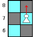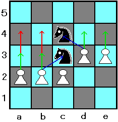 | アンパサン | 白Pが五段目にいてその隣の行の黒Pが2歩移動してきたときに(赤)、コレを一歩進んできたと同じようにみなして白Pが黒Pを取る事ができる(青)というルール。使用頻度は少ない。 | ![]() |