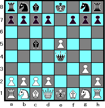 1 e4 e5 , 2 f4 Bc5 , 3 fe? Qh4+ , 4 g3 Q:e4+