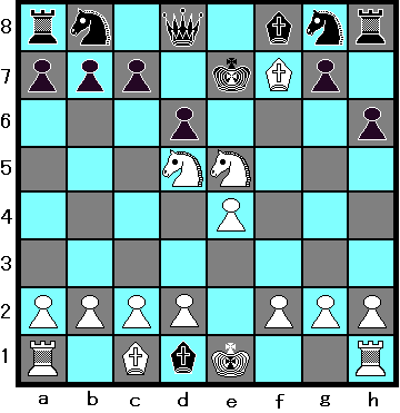 5 N:e5 B:d1 , 6 B:f7+ Ke7 , 7 N:d5#