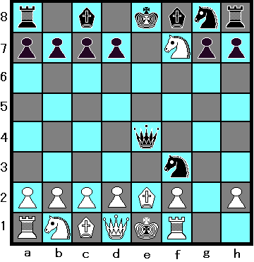 1 e4 e5 , 2 Nf3 Nc6 , 3 Bc4 Nd4 , 4 N:e5? Qg5 ,