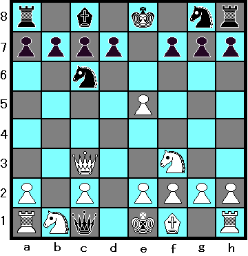 1 d4 e5 , 2 de Nc6 , 3 Nf3 Qe7 , 4 Bf4 Qb4+ ,