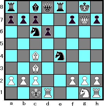 9 Qg3 B:c3 , 10 Bc3 N:e4?? , 11 Q:g7#