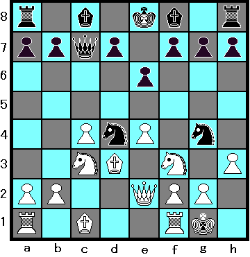 9 Nc3 Bd6 , 10 dc B:c5 , 11 e4 Ng4 , 12 h3?? Nd4