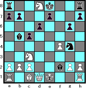 8 e6 fe , 9 Ng5 B:b5 , 10 N:e6 B:d4 ,